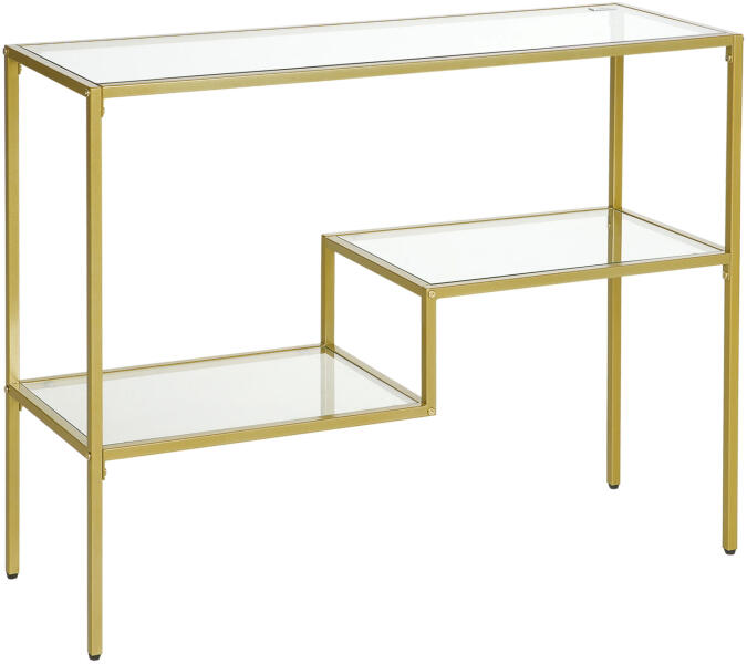 Elegáns konzolasztal 3 polccal - Tökéletes kiegészítője otthonodnak! ✨ Ez a stílusos konzolasztal ideális tárolási megoldás és dekoratív elem előszobádba, nappalidba vagy hálószobádba. A három polccal rendelkező asztal remekül alkalmas családi fotók, növények vagy egyéb kedvenc tárgyaid bemutatására. Főbb jellemzők:Elegáns design: Az átlátszó üveglap és az arany keret kifinomult megjelenést kölcsönöz. Masszív szerkezet: Tartós edzett üvegből és acélból készült a hosszú élettartam érdekében. Biztonság: A hátoldalon található rögzítő rendszerrel a falhoz rögzíthető a nagyobb biztonság érdekében. Állítható lábak: Az állítható védőbetétek stabilan tartják az asztalt egyenetlen felületeken is. Könnyű tisztítás: A sima üvegfelület könnyen tisztítható. Méretek:Méret típus Méret (cm)Teljes méret 100 H x 32 M x 76 MKözépső polc mérete 47,5 H x 28,5 MAlsó polc mérete 47,5 H x 28,5 MPolcok közötti távolság (fentről középre) 30Polcok közötti távolság (fentről aljára) 46Alap magassága 26,5Teherbírás: Teljes: 25 kg Felső polc: 15 kg Középső/alsó polc: 5 kg Szín: Arany, Átlátszó Anyag: Edzett üveg, acél Teremtsd meg a tökéletes hangulatot otthonodban ezzel a gyönyörű konzolasztallal! ?